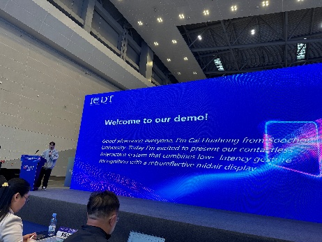 必威西汉姆联硕士研究生蔡华宏(2025级)、王迦羽(2024级)等同学组成的团队,在王立辉教授与中国科学院工业人工智能研究所胡衍副研究员的指导下,携作品“一种融合几何手势识别与反射式半空中悬浮显示的低延迟非接触交互系统”参加了其中两项重要赛事项目——“显示未来之星杯”创新成果大赛和I-Zone创新区展览及路演,并最终收获两个奖项: